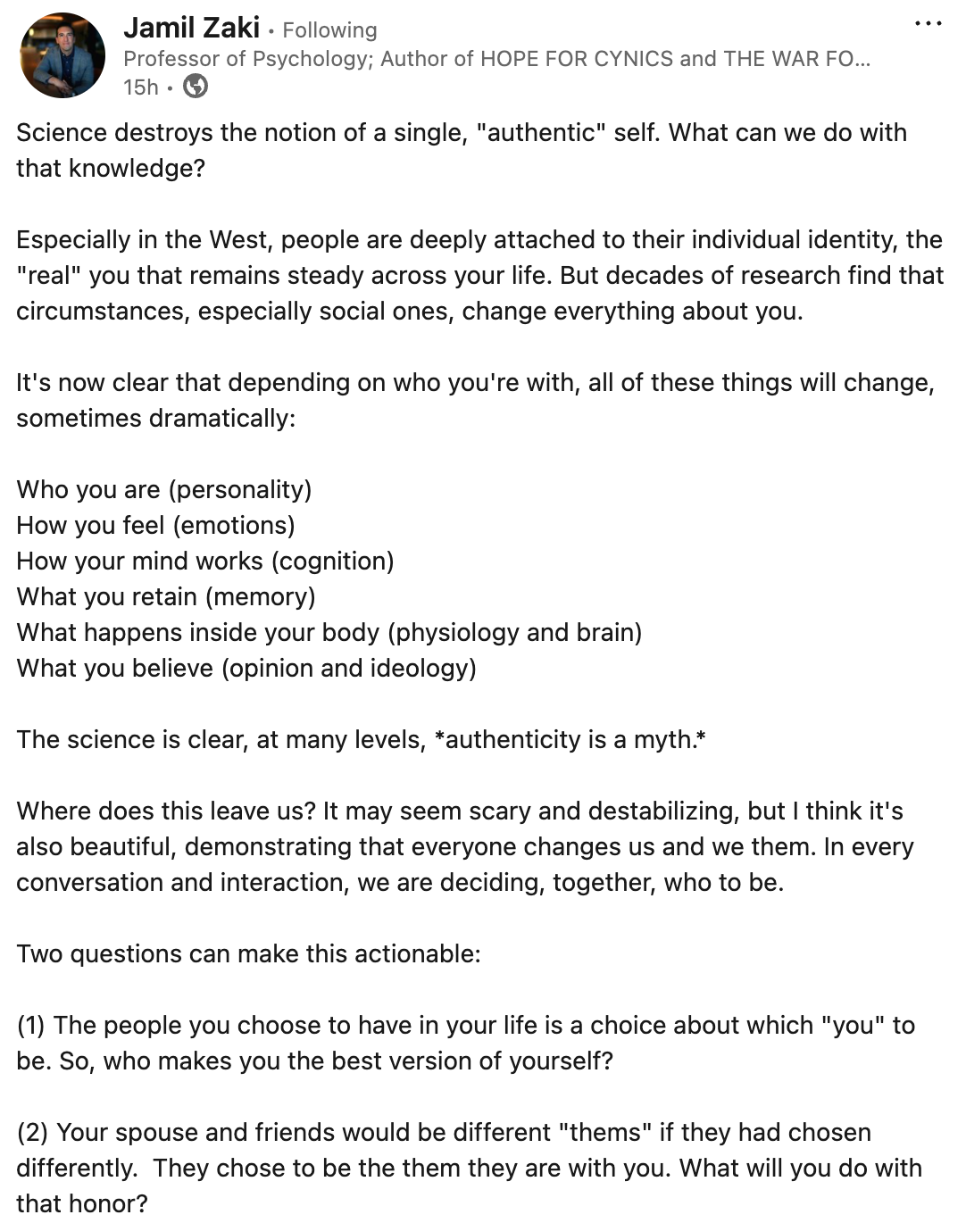 Stanford professor Jamil Zaki onderzoekt hoe ons ‘zelf’ wordt gevormd. Zijn ongezouten conclusie: er bestaat geen vastomlijnde identiteit. Omstandigheden, vooral sociale, veranderen alles aan wie je bent. Continu.
